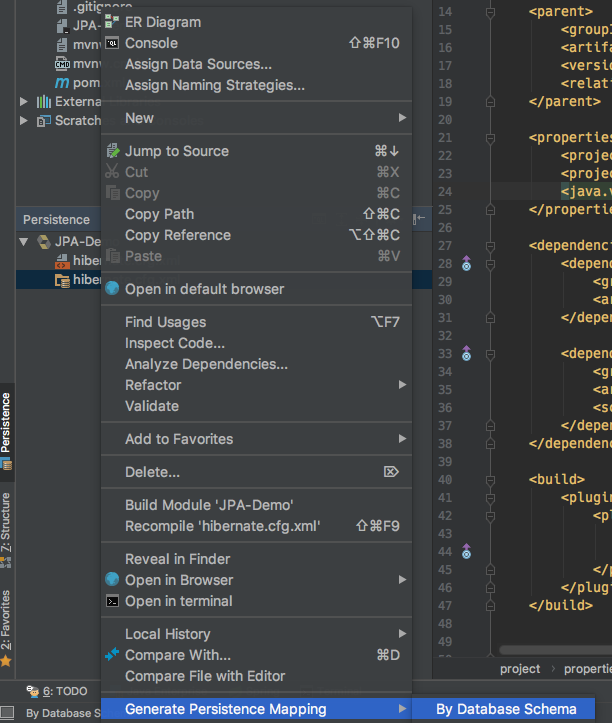 정상적으로 생성 되었으면 아래 그림처럼 왼쪽 사이드바 메뉴에 persistence 라는 메뉴가 생기고 이를 눌러보면 추가된 Hibernate module 이 표시된다.